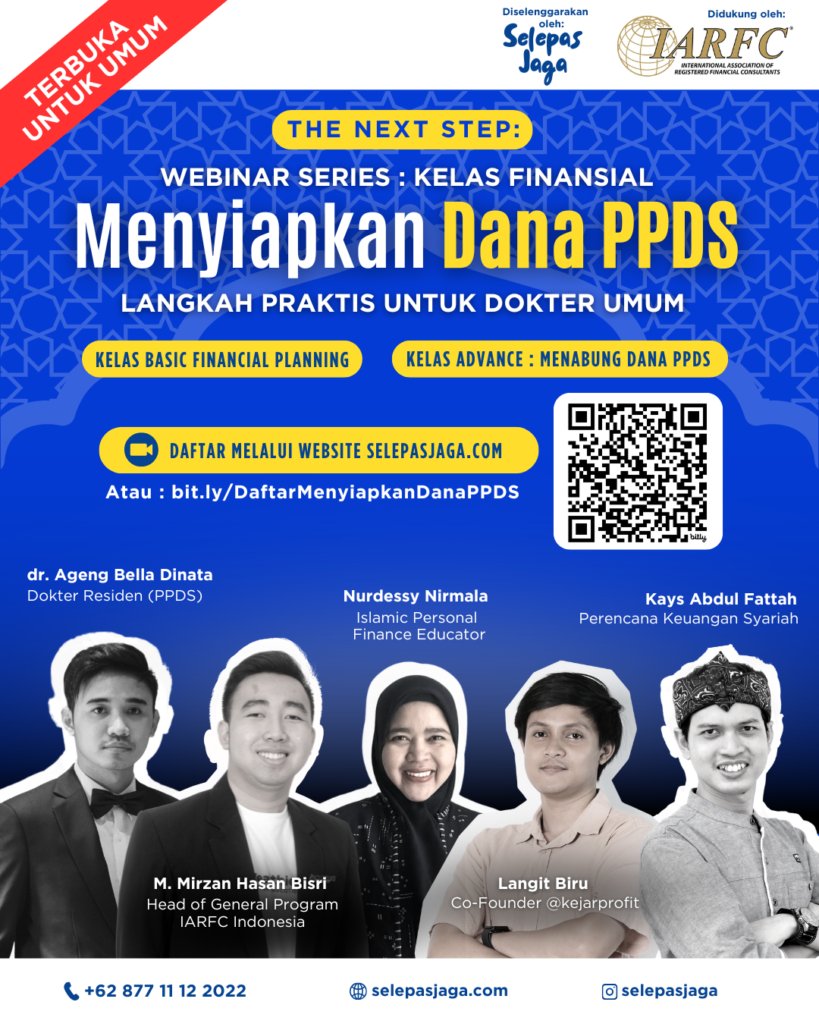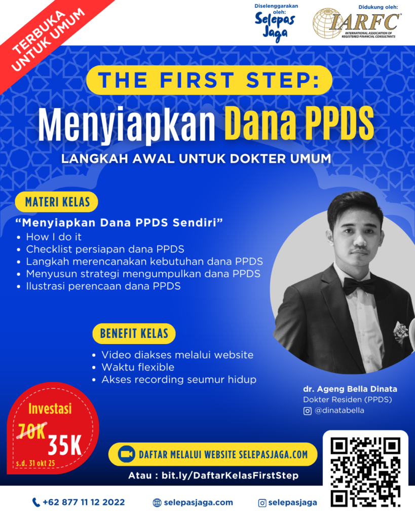 - INCLUDE BONUS KELAS FIRST STEP: Menyiapkan Dana PPDS (MANDIRI) dengan dr. Ageng; How I do it in 2 years, checklist persiapan PPDS, langkah merencanakan kebutuhan Dana PPDS, Menyusun strategi mengumpulkan dana PPDS, ilustrasi perencanaan dana PPDS (senilai Rp70.0000)